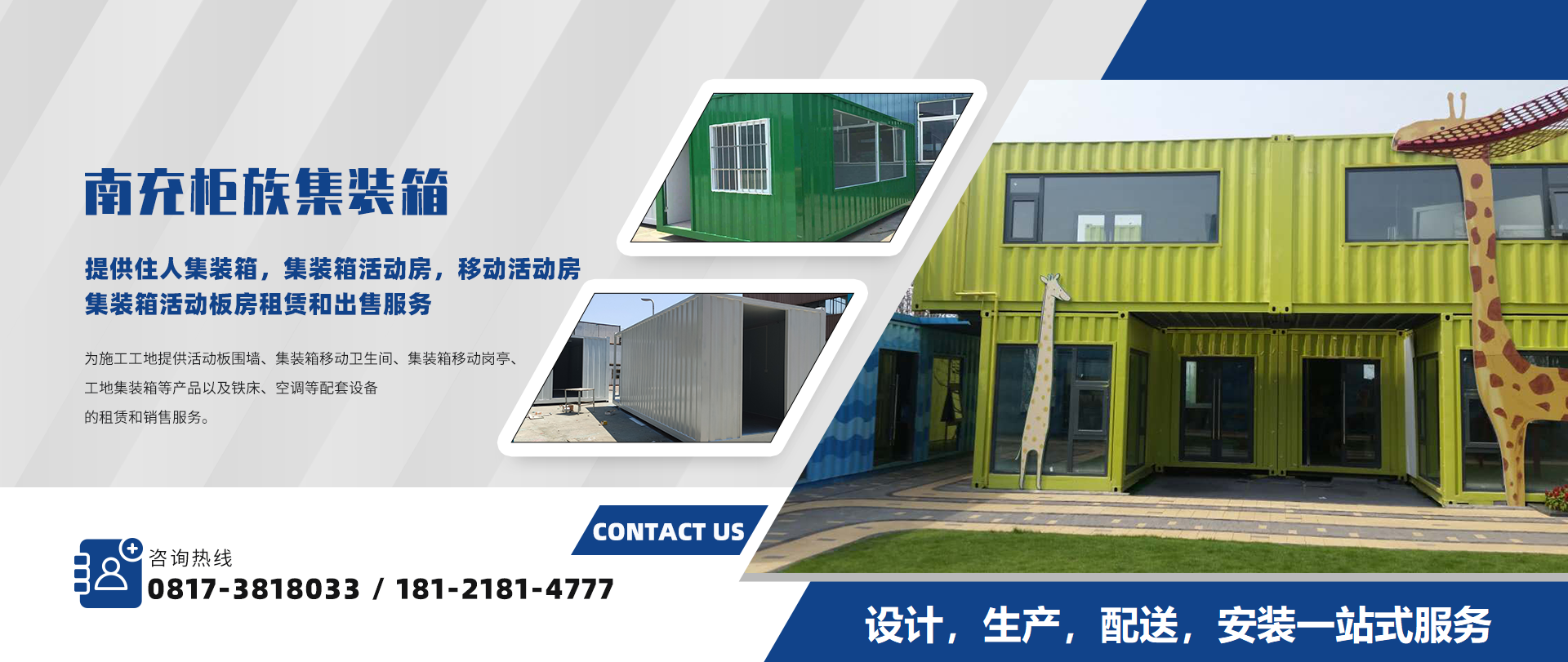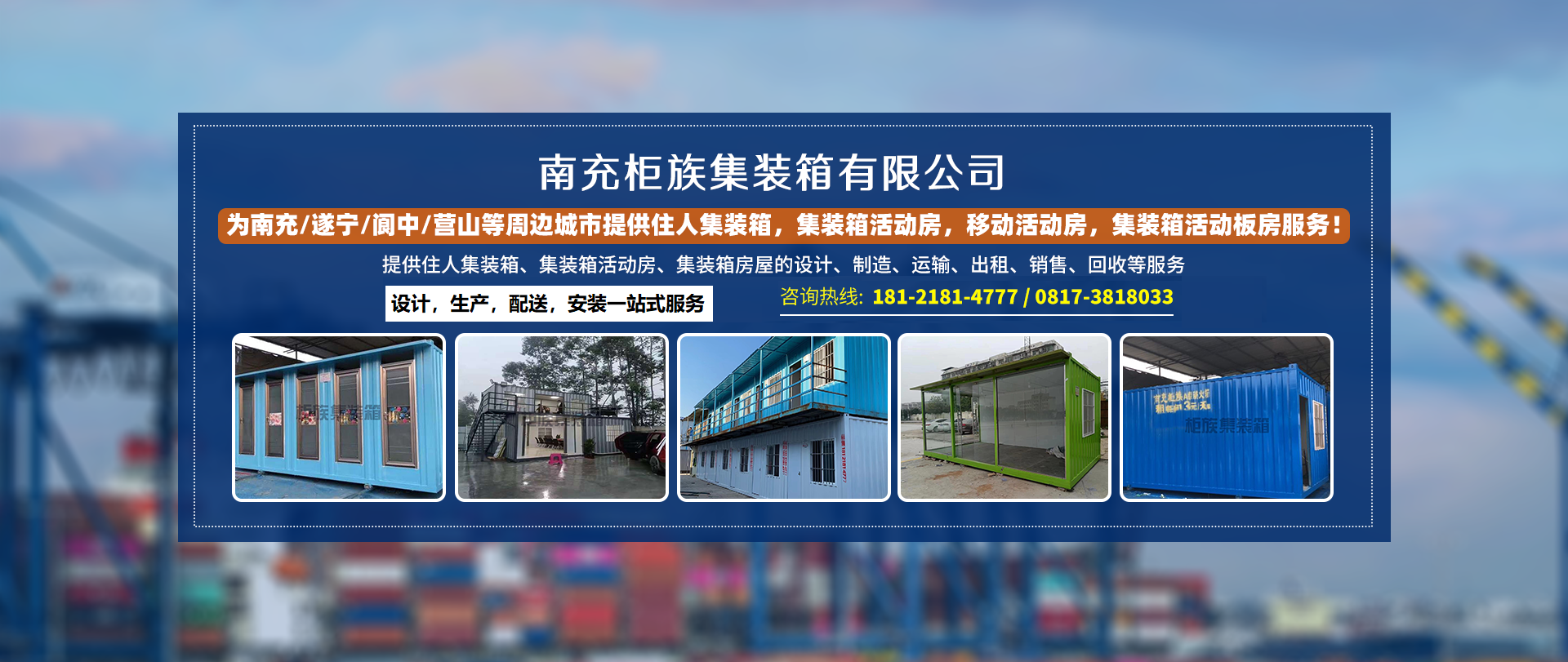 南充柜族集裝箱有限公司是一家為南充/遂寧/閬中/營(yíng)山/蓬安/南部/西充等周邊城市提供住人集裝箱,集裝箱活動(dòng)房,移動(dòng)活動(dòng)房,集裝箱活動(dòng)板房服務(wù)!本公司專(zhuān)業(yè)服務(wù)南充住人集裝箱、南充移動(dòng)活動(dòng)房、南...